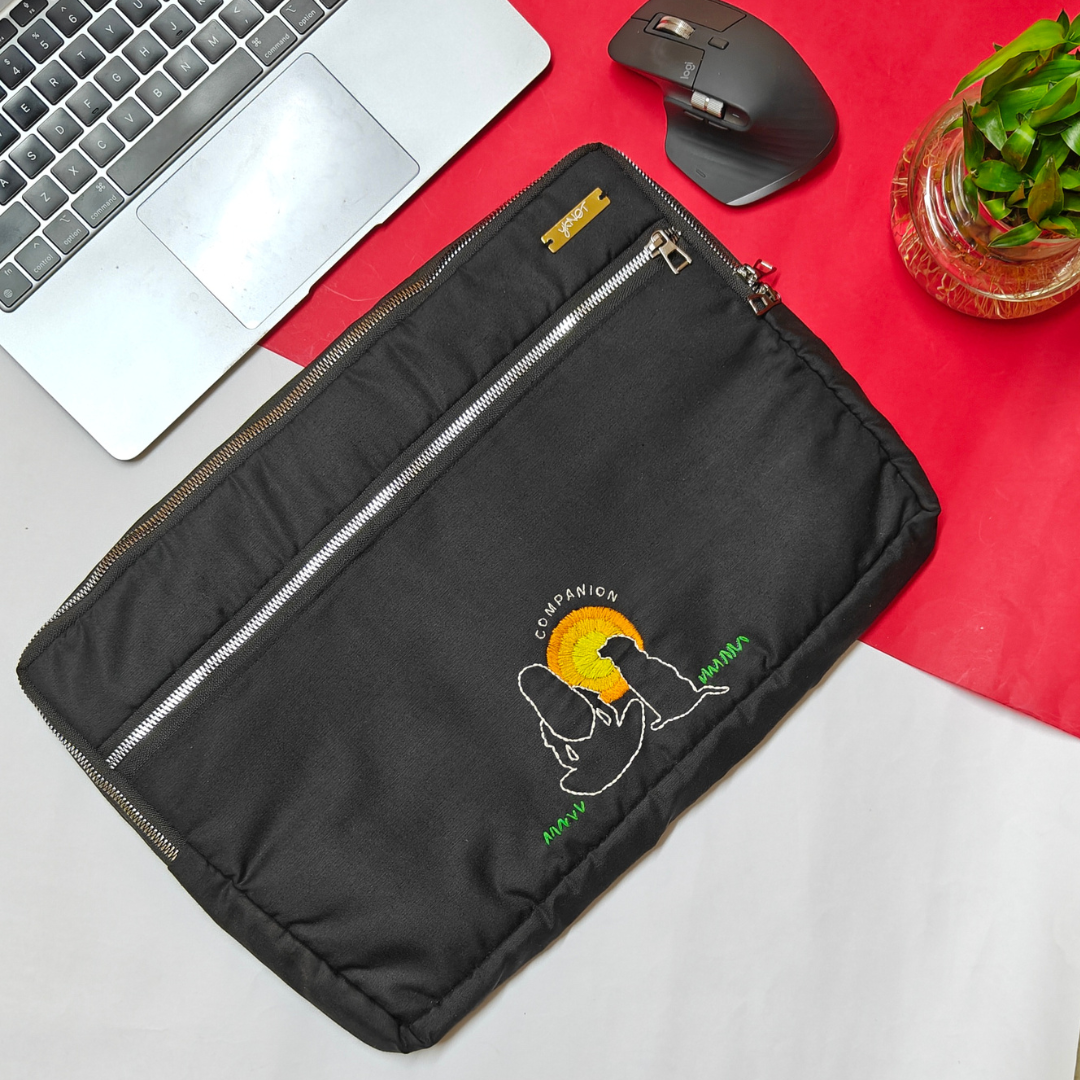 This laptop sleeve captures the quiet comfort of human–animal friendships through clean, minimal silhouettes — a boy or girl alongside a pet rabbit, bird, cat, dog, or tortoise. The simplicity of the artwork makes the emotion stand out, turning your sleeve into a soft piece of storytelling. Handcrafted by rural artisans with care, it provides padded protection while keeping warmth and connection at the centre of your workspace.